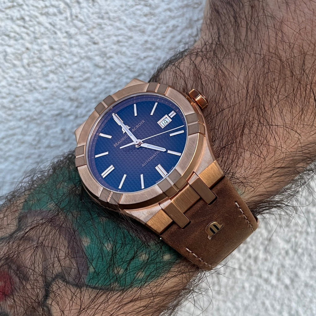 Discover luxury and sophistication with the Maurice Lacroix Automatic Bronze Dial Leather Strap Watch. This sleek 42mm watch for men features an automatic movement, bronze dial, and leather strap. Immerse yourself in the impeccable craftsmanship and timeless elegance of this timepiece. Elevate your style and make a statement with every wear.