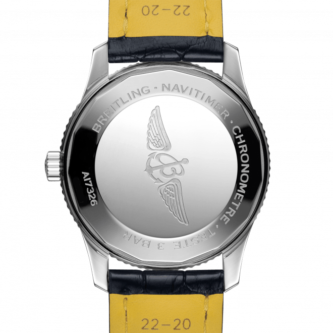 The Breitling Navitimer 1 Automatic 41 gives a different take on the Navitimer. Effortlessly combining the historic appeal of a true icon with the refinement of a sophisticated, contemporary timepiece. The watch features Breitling’s famous circular slide rule, as well as a distinctive beaded bezel in a 41mm stainless steel case. Its elegant, three-hand dial comes in cool blue and is rounded off with a date window at the 6 o’clock position. It is powered by the Breitling Calibre 17, a COSC-certified chronometer. The hour markers, as well as the hour and minute hands, are coated with Super-LumiNova®, a luminescent material that ensures excellent legibility in all lighting conditions. This Navitimer 1 Automatic 41 is on a blue alligator strap with a folding buckle. Compact, comfortable and cosmopolitan, it is an elegant reinvention of a timeless, legendary watch.