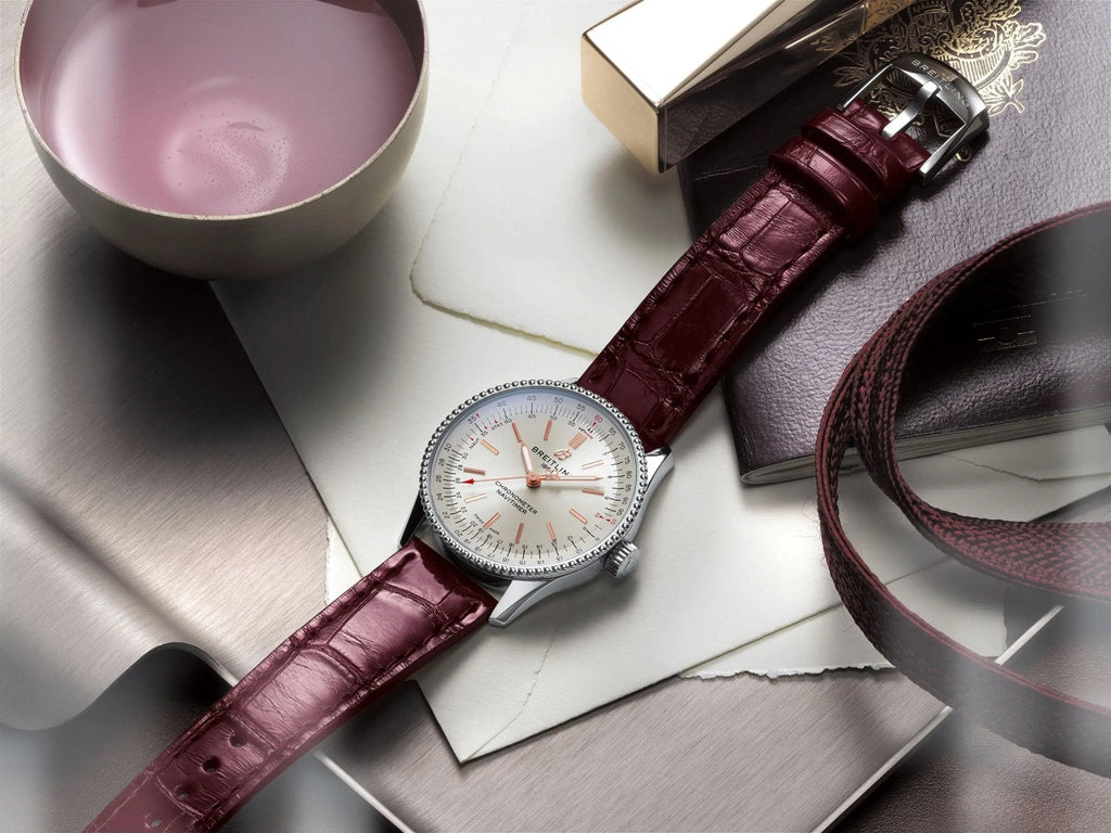 Breitling Navitimer 1 Automatic 38 mm watch. Model reference: U17325211G1P1. Steel and red gold case. Silver dial. Automatic movement. Brown alligator leather strap with pin buckle. Swiss made. Watch comes in original packaging, with set of documents