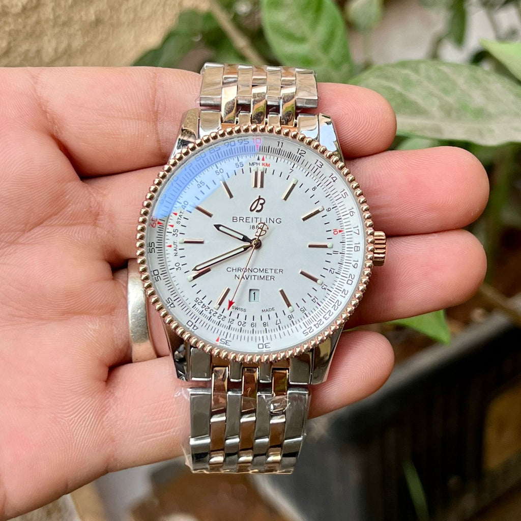 38 mm steel and red gold case, 10.10 mm thick, non screw-locked crown with two gaskets, bidirectional bezel with slide rule, cambered sapphire crystal with glareproof treatment on both sides, silver dial, Breitling 17 self-winding movement with date in dial aperture, approximately 38 hours of power reserve, steel Navitimer bracelet. Water resistant to 3 bars.