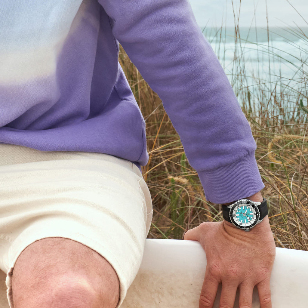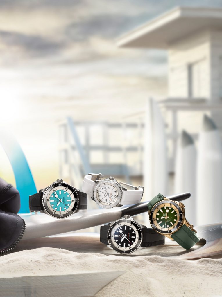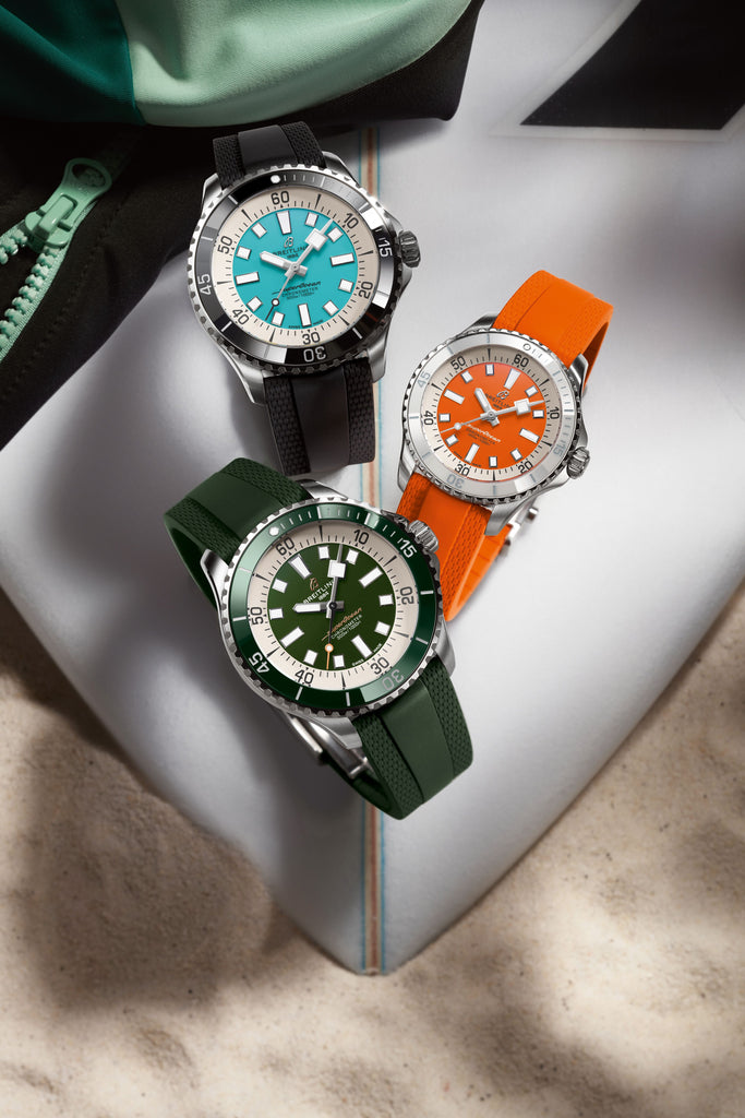 Performance and style for all your water-based pursuits. In the 1960s, the new sport of scuba diving was all the rage. For divers, timing was everything, and Breitling set out to give them the most clear-cut dive watch possible by eliminating any feature that didn’t support their lifesaving needs underwater. This pared-down watch was named the Slow Motion. What remained were clean lines, chunky luminescent indexes, squared-off hands and a high-contrast dial ring, all aimed at maximum legibility. Practical, yes. But what people really fell in love with was the look. The new Superocean retraces the Slow Motion's celebrated design codes, while adding modern features, like a ceramic-inlayed bezel and brightly colored dials. Broad hands and indexes in luminescent Super-LumiNova® allow for easy readability underwater. The watch is water resistant to 300 m (1000 ft), as well as being shock-, sand- and saltwater-resistant. The bronze version uses a special alloy that has excellent resistance to corrosion, yet will still develop a subtle patina over time that makes the watch even more unique. The two strap options (rubber and metal bracelet) have a folding clasp that allows for micro-adjustments of up to 15 mm for easy wear over rashies and wetsuits. Its scratch-proof ceramic inlayed bezel will never wear or fade. For safety, the bezel is uni-directional on most sizes and bi-directional with a patented lock on the 46 mm. Best of all, this is no longer strictly a dive watch—surf with it, swim with it, hit the beach bar with it, then wear it out to dinner. The Superocean perfectly balances the nostalgia of its heritage with a fresh new look.