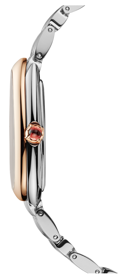 Launched to great acclaim at Baselworld 2019, the Bvlgari Serpenti Seduttori lends time a precious edge. The elegant stainless steel case is fitted with a rose gold bezel, a cabochon-cut pink rubellite decorates the crown. On the white-silver opaline dial, rose gold tone Roman indices mark the hours. A stainless steel link bracelet with a folding clasp adds the finishing touch to this Swiss Made quartz watch.