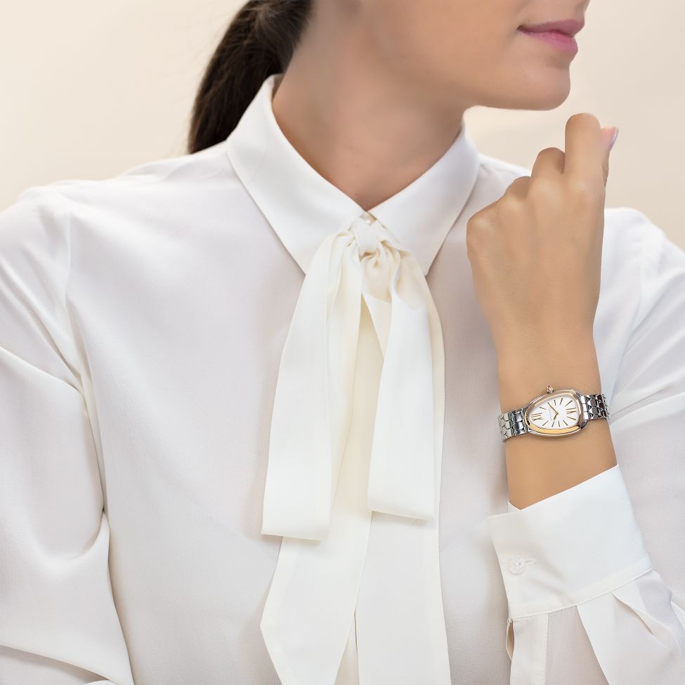 Gleaming with the refined sheen of its materials, the Serpenti Seduttori watch in 18 kt yellow gold and stainless steel makes time even more precious. Reimagining Bulgari’s icon of seduction with a striking new design, the timepiece boasts the distinctive drop-shaped watch head and a white silver opaline dial. Inspired by the scales of a serpent, a sensual and flexible bracelet features a hexagonal pattern, conjuring the glamour of jewellery through captivating aesthetics.