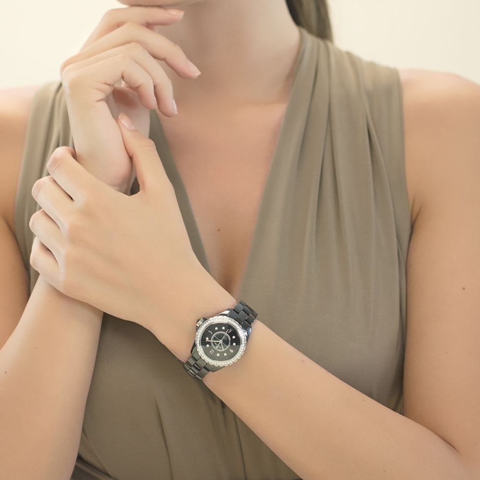 Chanel J12 Black Ceramic Diamond bezel 33 mm watch. Model reference: H3108. Black high-tech ceramic and steel case. Bezel set with 54 brilliant cut diamonds (~1 carat). Black dial set with 8 diamond indicators. High precision quartz. Black high-tech ceramic bracelet.
