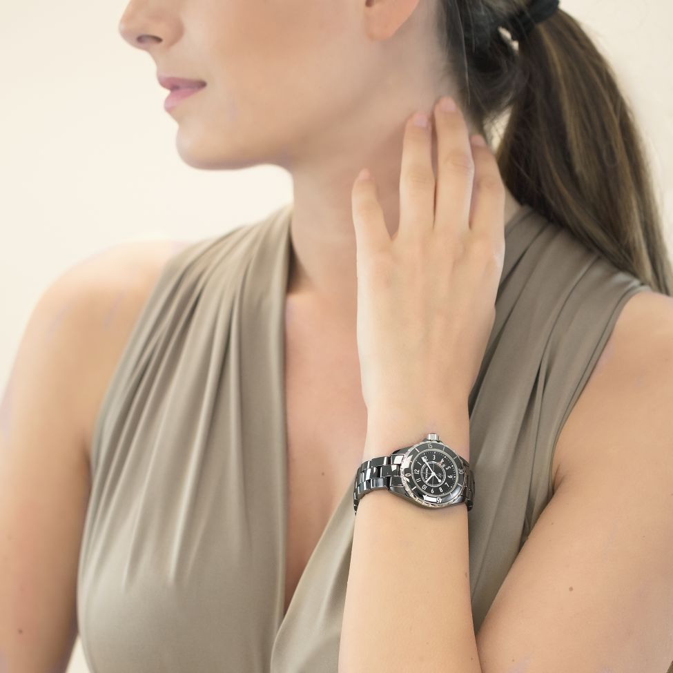 An icon of modern watchmaking now featuring the Calibre 12.1, the J12 has been reinvented while preserving its identity, which is the reason behind its legendary status. The black highly resistant ceramic and steel case is showcased with the unidirectional rotating bezel feature. The black lacquer dial has an inner railway of indicators and the original typeface of the numerals has been redesigned to enhance and refine the design, as they are set in ceramic. The hands are now luminescent in black Super-LumiNova on the J12.The chronometer offers a 70-hour power reserve. The feature of the steel screw-down crown with black highly resistant ceramic cabochon. Presented on a black ceramic bracelet and steel triple-folding buckle. Swiss-made with a high precision quartz movement with 200m water resistance.