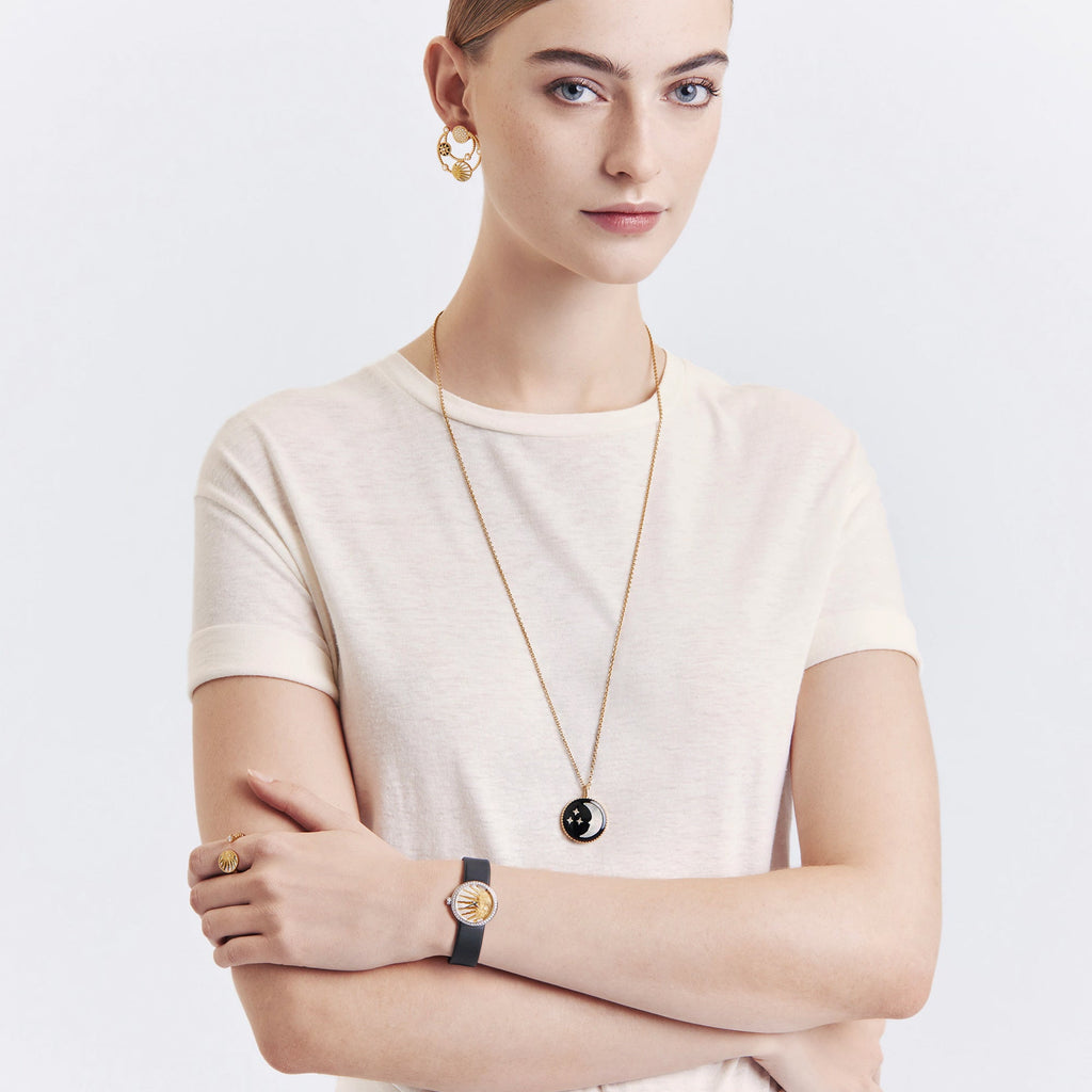 This D by Dior watch is distinguished from the other models in the line by the pattern on its pearly dial. Day from the front and night from the back, this creation signed by the famous Haute-Couture Maison is a true jewelry watch...