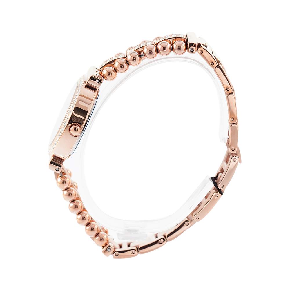 This intricate bracelet design is truly one of kind and beautifully crafted with a unique ball and crystal connection featuring a fully crystal bezel with silver dial.