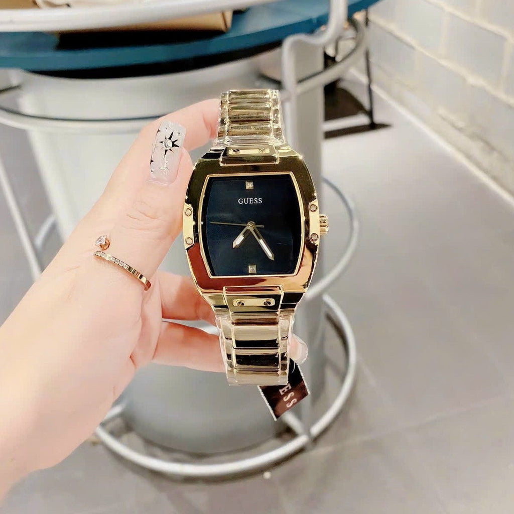 A genuine diamond dial keeps this phoenix on the rise. Featuring a gold-tone barrel shaped case with a black dial on a sleek 3-link bracelet.