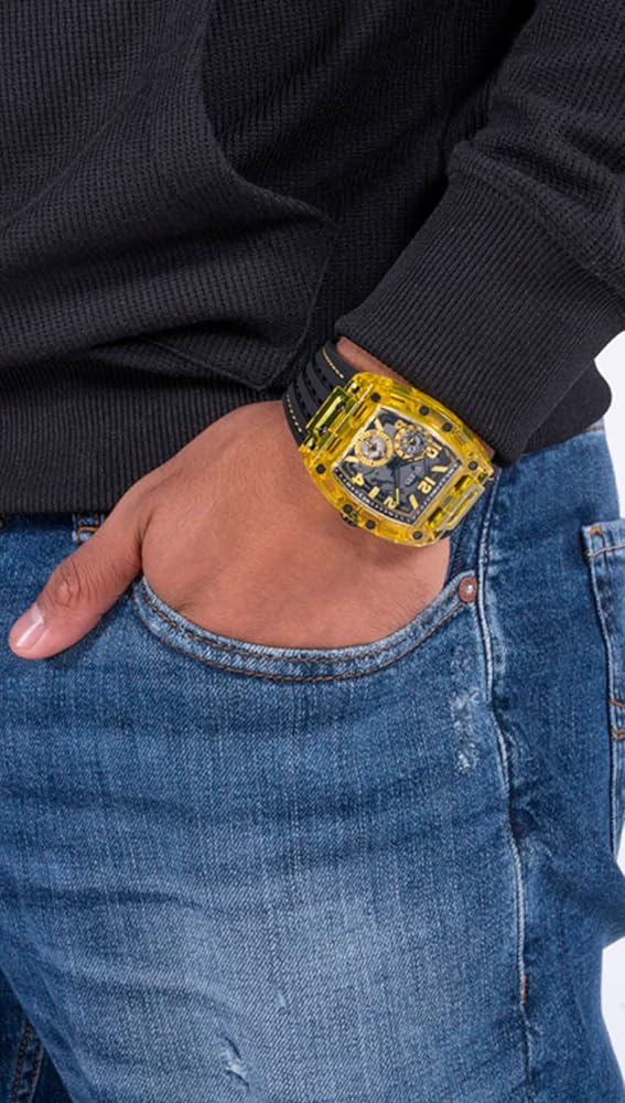 Skeleton dial details keep this phoenix on the rise. This style features a polycarbonate cut-thru barrel shaped case with black screw details and a cut-thru multi-function dial paired with a silicone strap with contrast stitching.