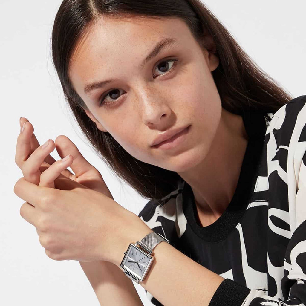 Stainless steel case with a stainless steel milanese mesh bracelet. Fixed stainless steel bezel. Silver dial with silver-tone hands and crystal-tipped index hour markers. Dial Type: Analog. TMI caliber VJ21 quartz movement. Scratch resistant mineral crystal. Pull / push crown. Solid case back. Square case shape. Case dimensions: 30 mm x 30 mm. Case thickness: 7 mm. Band width: 16 mm. Milanese clasp. Water resistant at 30 meters / 100 feet. Functions: hour, minute, second. Casual watch style. Watch label: Japan Movt. Armani Exchange Lola Quartz Crystal Silver Dial Ladies Watch AX5800.