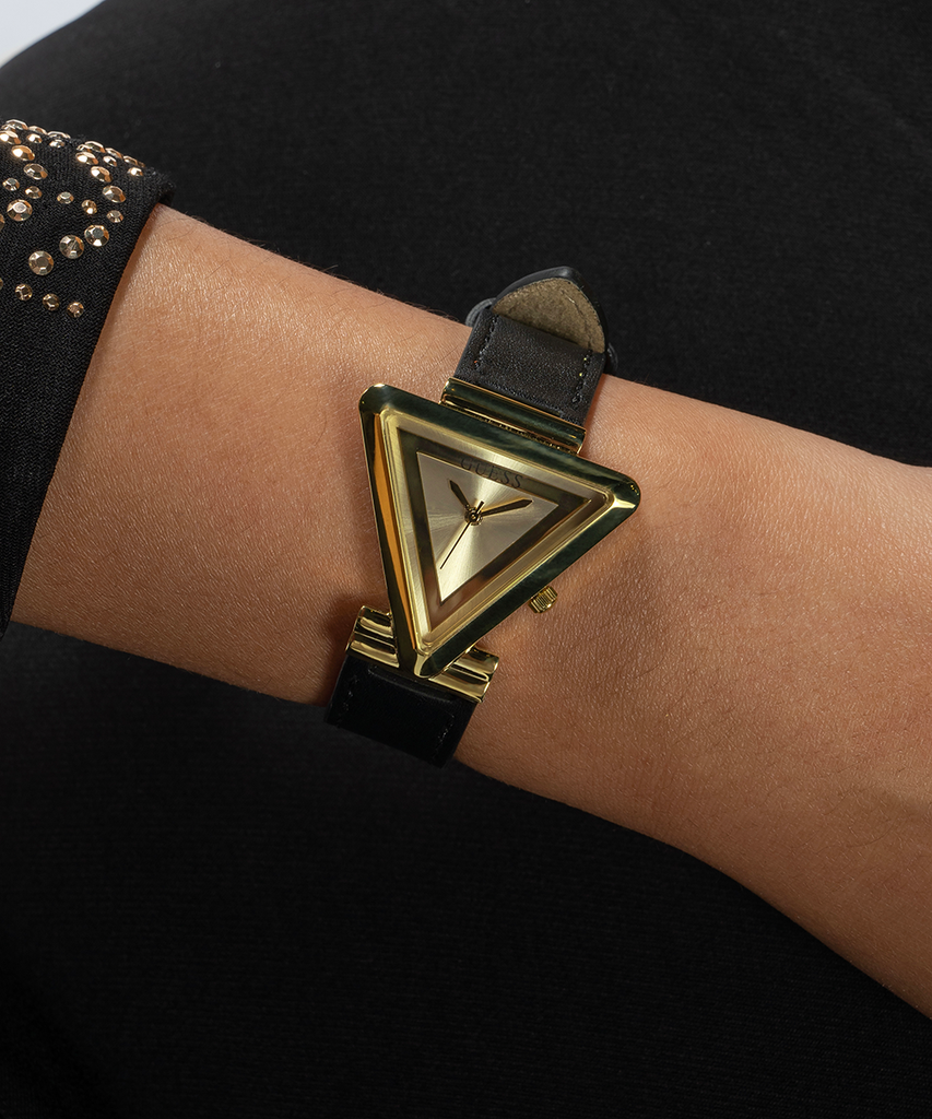 Guess Fame Quartz Gold Dial Black Leather Strap Watch For Women - GW0548L3