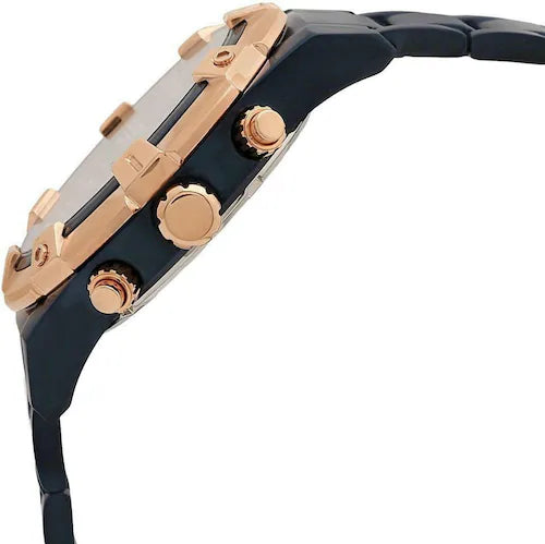 Blue ion-plated stainless steel case and bracelet. Fixed blue ion-plated bezel with a rose gold ion-plated top ring. Dark blue dial with rose gold-tone hands and index hour markers. Minute markers around the outer rim. Dial Type: Analog. Chronograph - three sub-dials displaying: 60 second, 60 minute and 24 hour.