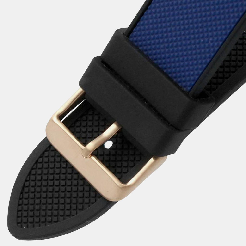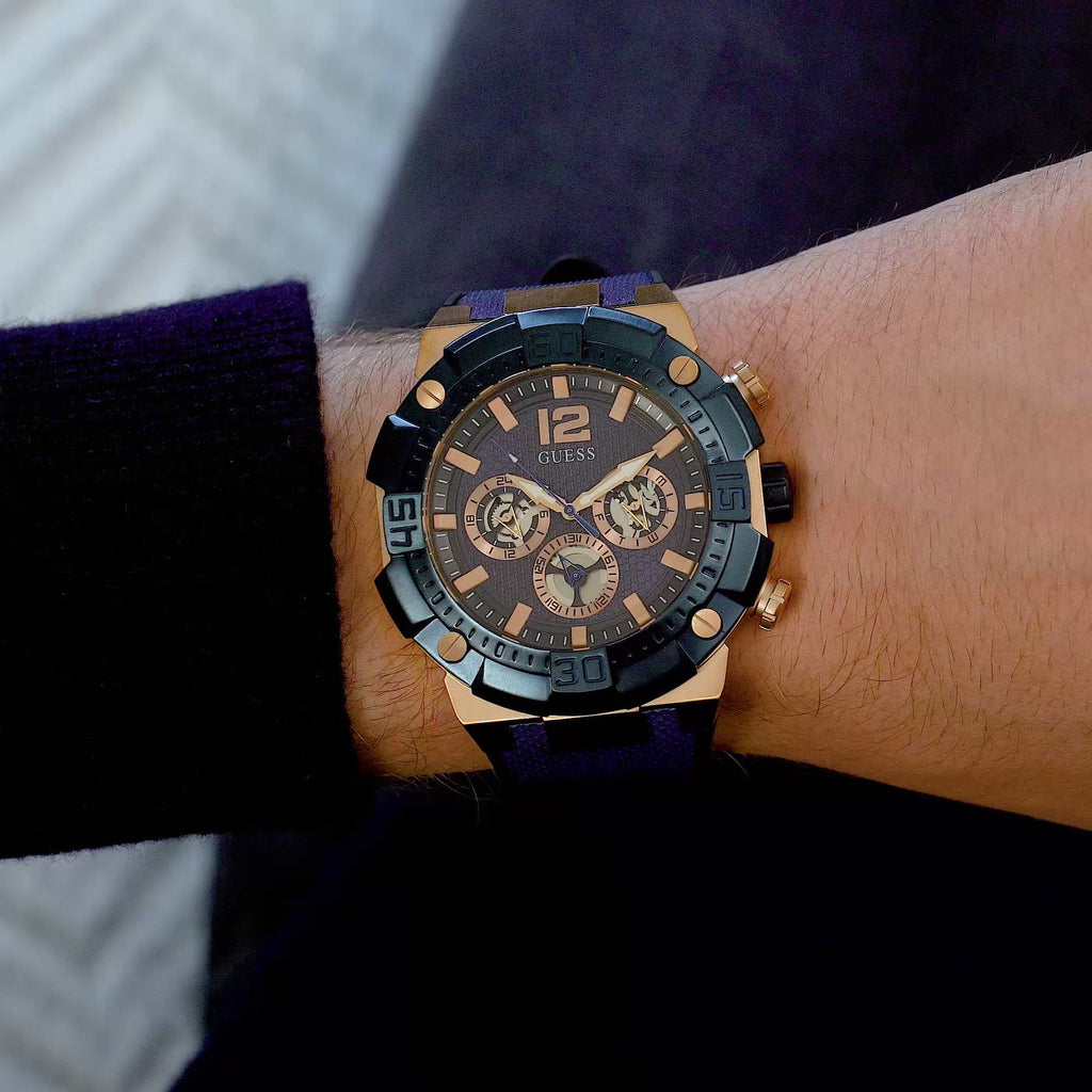 The Guess Mens Navigator Rose Gold & Blue Dial GW0264G4 watch combines a 50mm round shaped stainless steel case and blue rubber strap with a traditional buckle. It has a blue analogue dial which is protected beneath mineral crystal glass. Power is generated by the quartz movement. This model also has a water resistance of up to 50 metres.