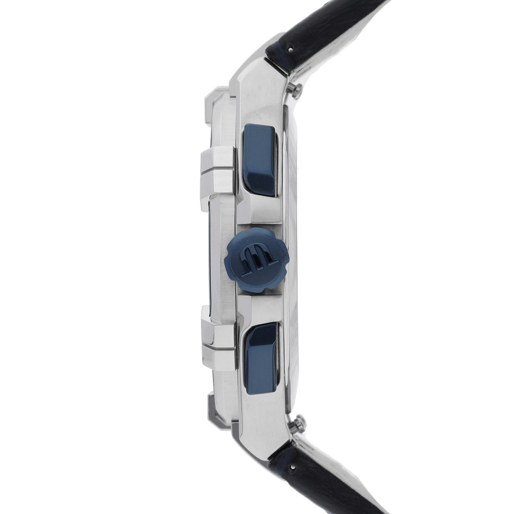 Experience the unique shape and impressive design of the Maurice Lacroix Aikon Chronograph Blue Dial Leather Strap 44mm Watch For Men - AI1018-SS001-432-4. This watch is the perfect choice for watch enthusiasts and those who appreciate a sporty and versatile timepiece for any occasion.