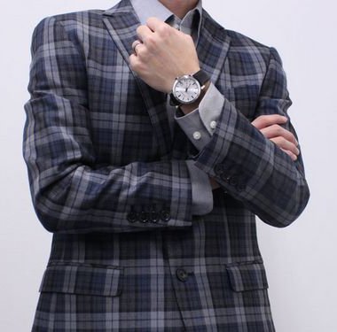 Stainless steel case with a black leather strap. Fixed stainless steel bezel. Silver dial with engraved check pattern, with silver-tone hands and index hour markers. Minute markers around the outer rim. Dial Type: Analog. Date display at the 3 o'clock position. Quartz movement. Scratch resistant sapphire crystal.