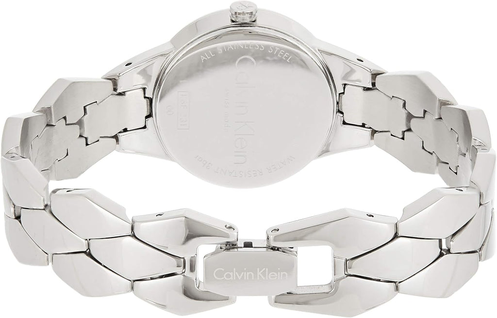 Stainless steel case with a stainless steel bracelet. Fixed stainless steel bezel. Silver dial with silver-tone hands. No markers. Dial Type: Analog. Quartz movement. Scratch resistant mineral crystal. Pull / push crown. Solid case back. Round case shape. Case size: 28 mm. Case thickness: 8 mm. Band width: 16 mm. Jewelry clasp. Water resistant at 30 meters / 100 feet. Functions: hour, minute. Casual watch style. Watch label: Swiss Made. Calvin Klein Snake Silver Dial Ladies Watch K6E23146.