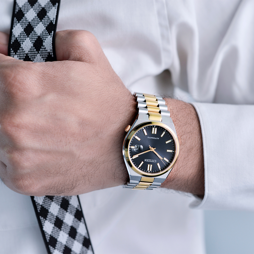 The Tsuyosa Automatic watch from the Mechanical collection embodies ultramodern sports style with its versatile 40mm case. The sleek design features a two-tone gold and stainless steel case and matching bracelet, all seamlessly integrated for a strong impression. The anti-reflective sapphire crystal showcases an anthracite grey dial, enhanced by a 3 o'clock date window and gold and silver-tone details for a classic aesthetic. Powered by an automatic movement and with 50 meters of water resistance, this refined timepiece is a perfect choice for daily wear, whether for work or play.