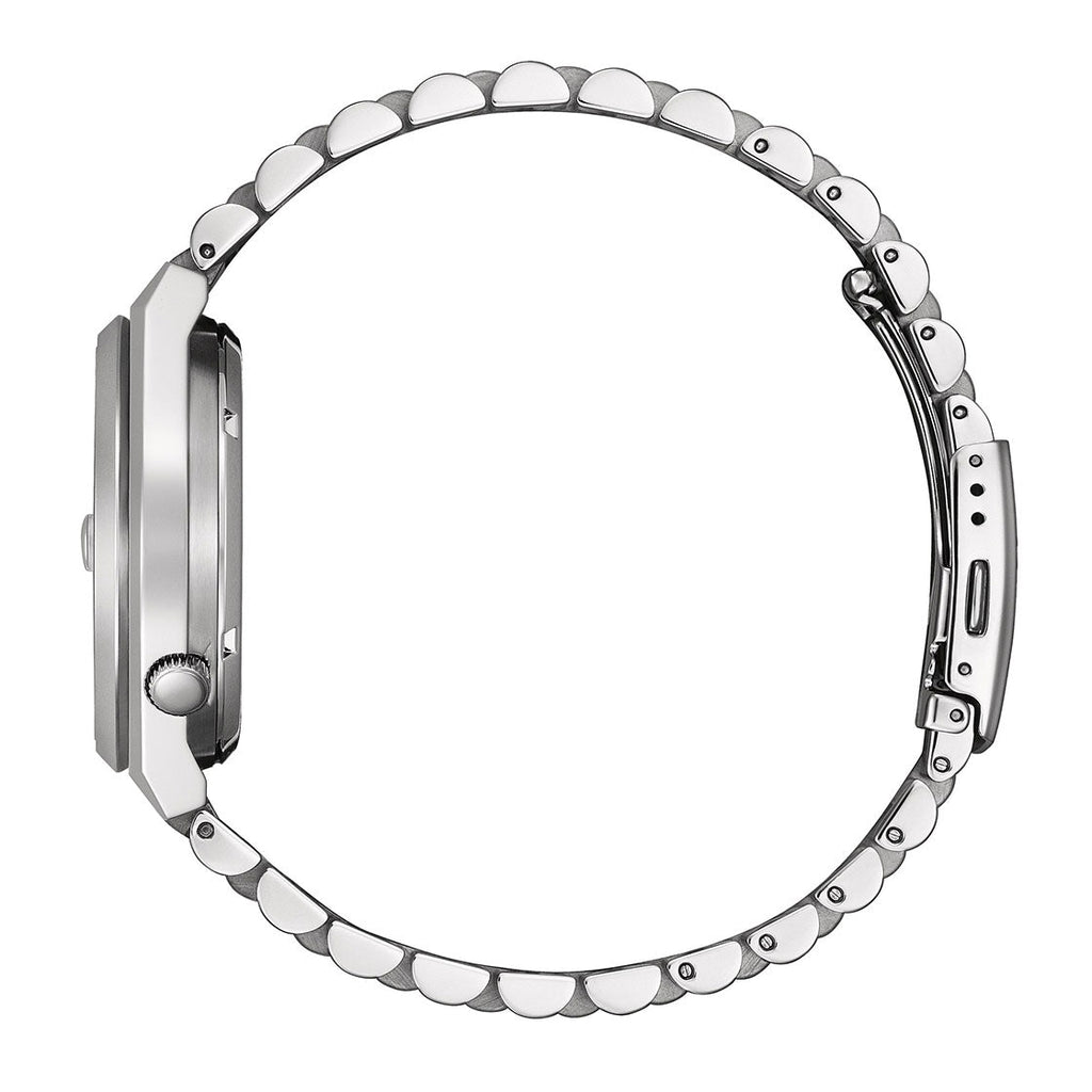 The watch features a date display under a sapphire crystal with a date magnifier, a skeleton case back that reveals the detailed mechanics, and a stainless-steel bracelet with a fold-over clasp and push button for added security. With a water resistance of 5 Bar, it is perfect for daily wear. This piece embodies CITIZEN's dedication to precision, elegance, and quality, making it a fitting choice for those who value both aesthetic beauty and functionality in their timepieces.