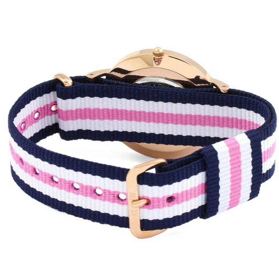 A classy and eye catching womens watch from Daniel Wellington. It features ultra-thin casing, white dial, rose gold stainless steel case paired with blue, pink and white fabric strap. It has a 30 meters water resistance that can be worn in hand washing.