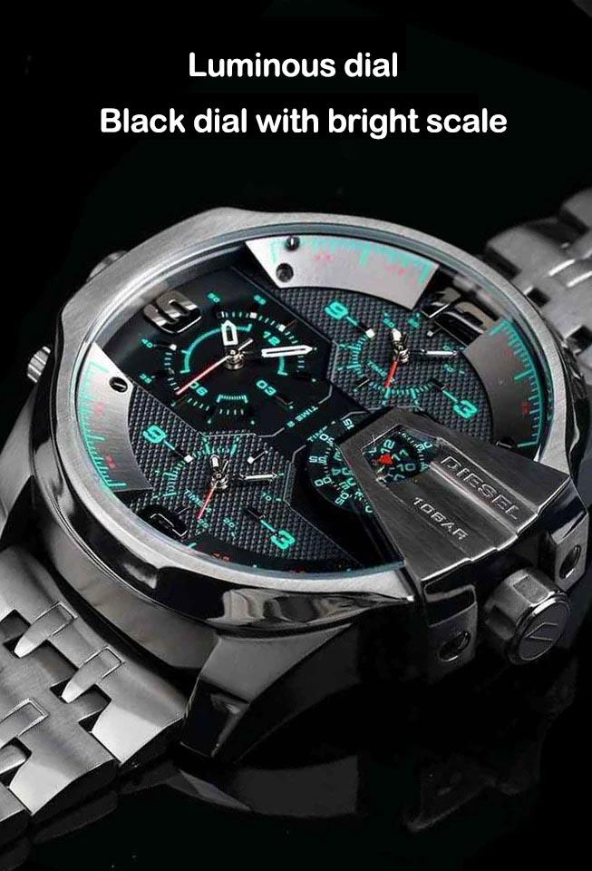 Dominate the field in the gunmetal Diesel Uber Chief watch. The textured black chronograph dial features applied gunmetal Arabics with blue and red tracking accents.
