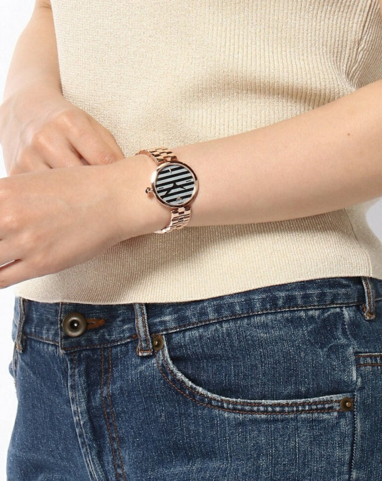 A beautiful slim case with a classic feel. The blue cabochon set into the flower motif crown adds a romantic touch to the minimalist design. It has a feminine and elegant finish that is typical of Emporio Armani.