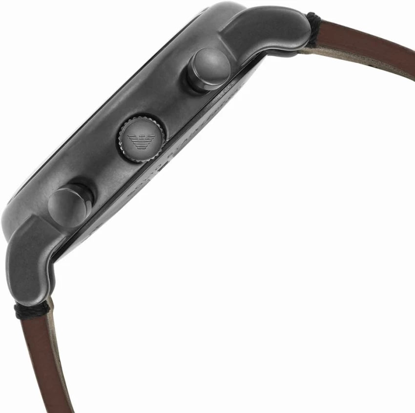 Fashion meets function with this chronograph watch from Emporio Armani. The Grey Stainless Steel case features a Black dial, with three subdials (chronographs) and a date window for added functionality. The Brown Genuine Leather bracelet adds the finishing touch.