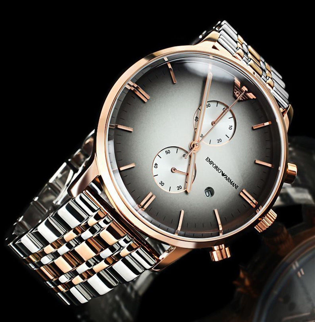 A very attractive Emporio Armani Chronograph Grey Dial Two-Tone Men's Watch AR1721 in a two-tone design made from steel and rose plated steel. This watch features a special grey dial which fades lighter towards the center. The dial also includes rose baton hour markers, slender rose hands, chronograph and date function. This watch fastens with a hidden deployment on a two-tone bracelet and powered by a quality quartz movement.
