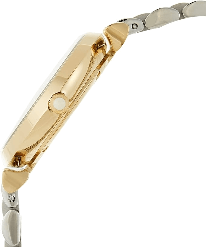 Two:tone stainless steel case. Two:tone stainless steel bracelet. Silver dial. Quartz movement. Water resistant 30 meters. Case 32 mm.