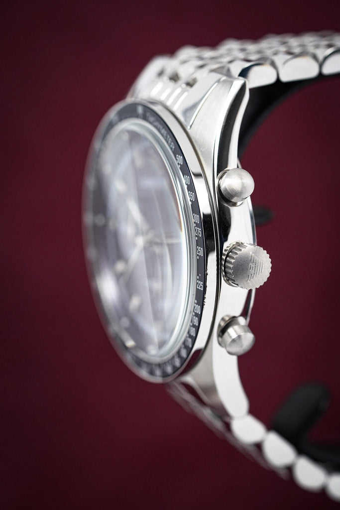 46mm x 13mm Stainless Steel Case. Solid Caseback. Blue Tachymeter Bezel.