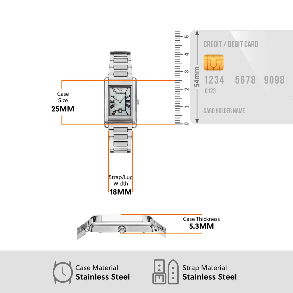 - Emporio Armani's 25 x 38mm stainless steel watch is distinguished from the crowd. Featuring a sleek rectangular case and a two-hand date quartz movement, this timepiece stands out with its glossy mother-of-pearl dial adorned with black Roman numeral indexes. The stainless steel H-link bracelet adds a touch of refinement, making it perfect for any dress occasion.