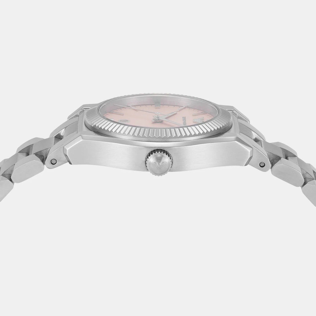 Emporio Armani's 32 mm watch features a striking pale pink sunray dial, three-hand date movement, and a stainless steel bracelet. The fluted stainless steel bezel adds an element of visual intrigue, making the perfect complement to the structured watch case and bracelet.