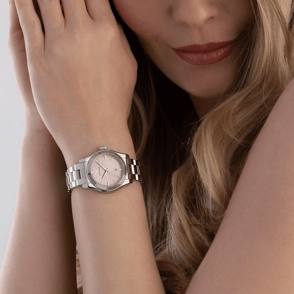 This 32mm watch features a striking pale pink dial, three-hand date movement, and a stainless steel bracelet. The fluted stainless steel bezel adds an element of visual intrigue, making the perfect complement to the structured watch case and bracelet.