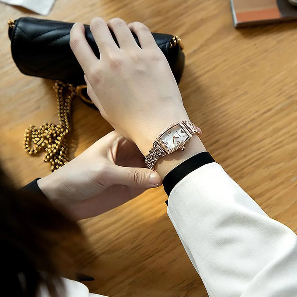 A must-have timepiece for all the watch aficionados, this women's analog watch from Emporio Armani will be a perfect pick. Its strap vaunts a rose gold hue that enhances the look of the watch. Housed in a case, the silver rectangular dial is protected by a mineral glass. It showcases plain 2-hand, and a crown for time adjustment. Furthermore, it is complemented with a push button clasp clasp that ensures a secure fit on the wrist.