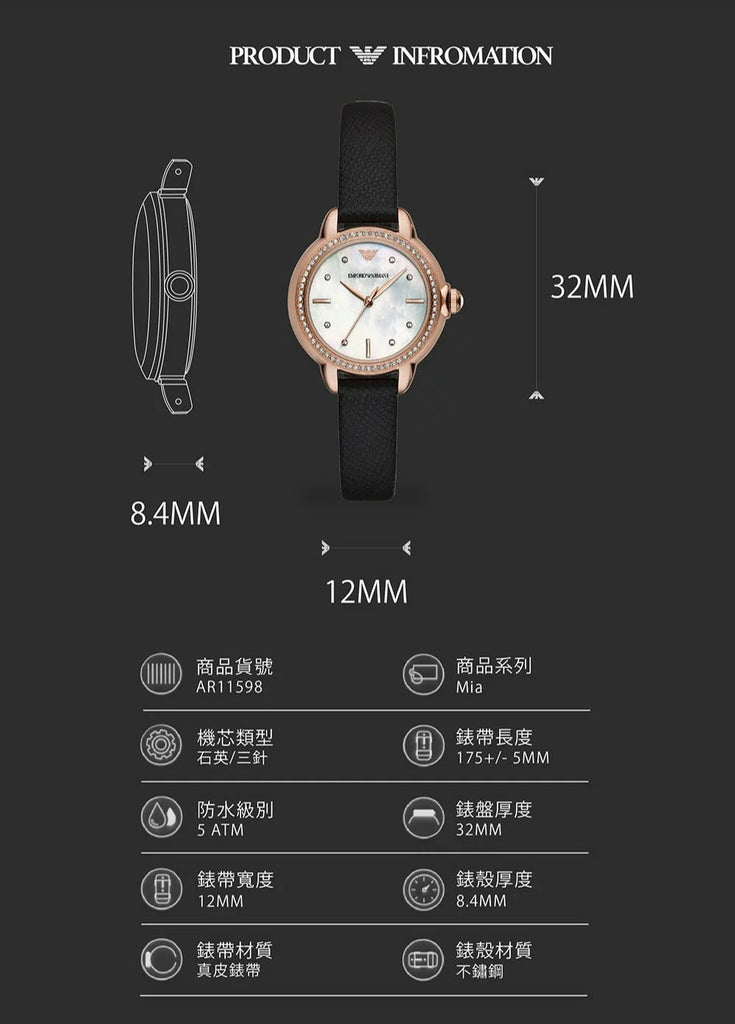 - Emporio Armani's 32mm watch features a white mother of pearl dial, three-hand movement and black leather strap