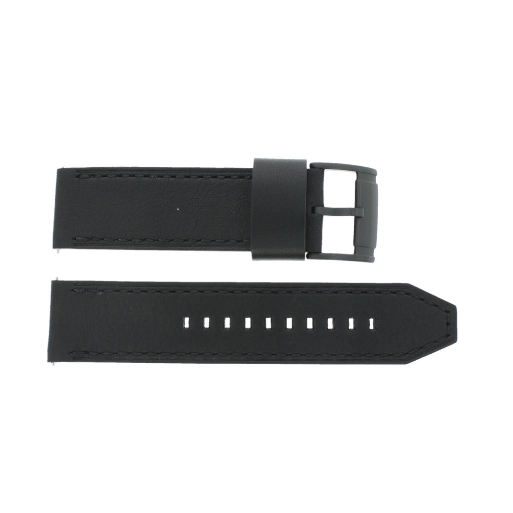 Black ion-plated stainless steel case with a black leather strap. Fixed black ion-plated bezel. Black dial with grey hands and index hour markers. Arabic numerals mark the 3, 6, 9 and 12 o’clock positions. Minute markers around the outer rim.