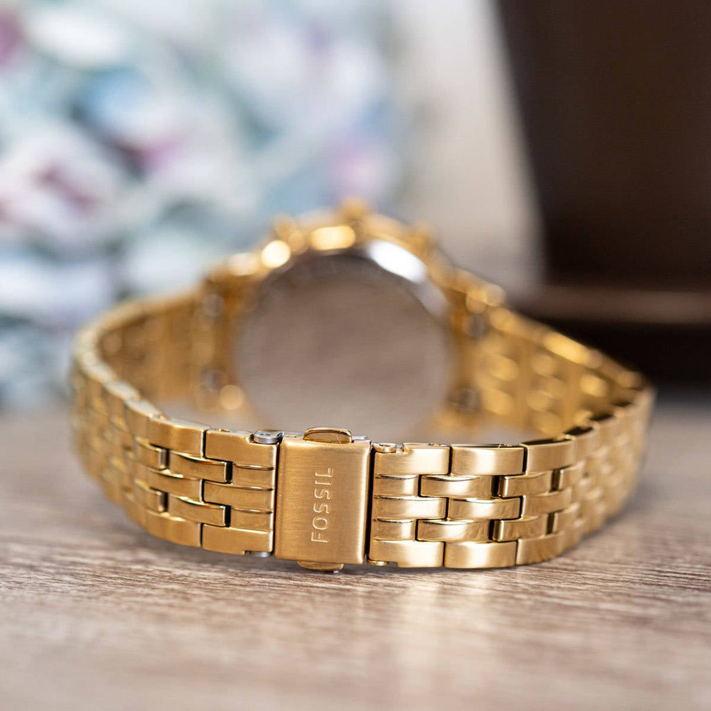 Fossil women's chronograph watch from the neutral collection. Watch with 36 mm case made of stainless steel with mixed gold color finish. The case is round in shape with a thickness of 10 mm. The glass is transparent and the dial is gold in color.