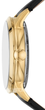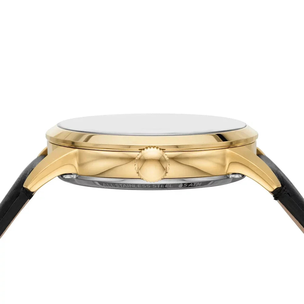 The Townsman collection is based on a minimalist style inspired by the 1960s – symmetrical shapes that put the construction and overall look at the fore. The model is made of stainless steel with a gold finish combined with mineral glass and has a golden skeleton display and a black leather strap. The mechanism is automatic. Case diameter - 44 mm, case thickness - 12 mm, strap length - 200 mm (+/- 5 mm), chain width - 22 mm. Water resistance: 5 ATM - light splashes and showering are allowed, heavy wetting is not recommended.