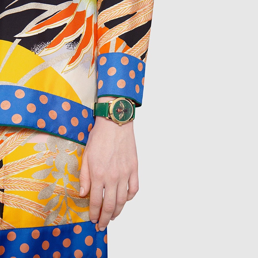 Part of the G-Timeless collection, this watch in elegant leather strap emerald green. Symbol from the Gucci archives of the 70s, a bee adorns the centre of the dial. Product details: Yellow gold PVD coated case, brown dial leather emerald green with bee leather strap emerald green.