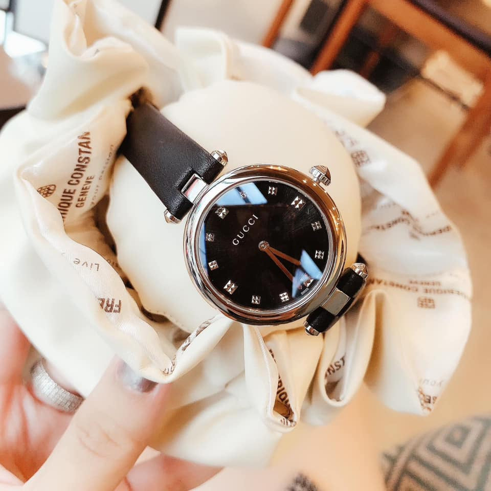 Gucci Diamantissima Diamonds Black Dial Black Leather Strap Watch For Women - YA141403