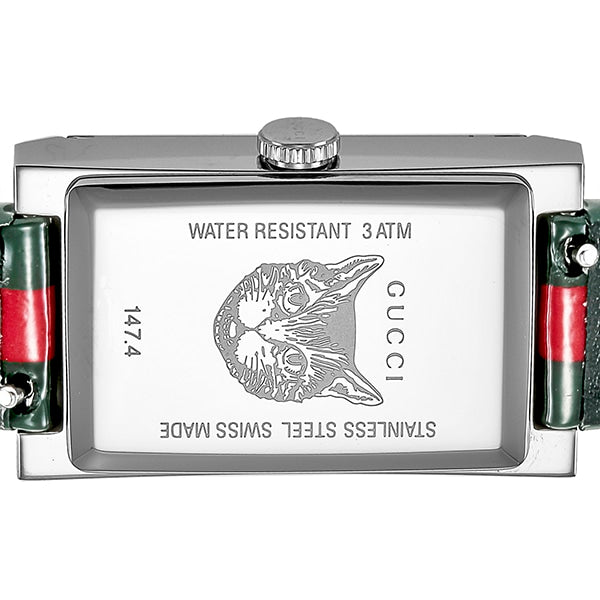 Rectangle case shape. Case dimensions: 21 mm x 34 mm. Case thickness: 9.5 mm. Strap width: 18 mm. Tang clasp. Water resistant at 30 meters / 100 feet. Functions: hour, minute. Casual watch style. Watch label: Swiss Made. Gucci G-Frame Quartz Ladies Watch YA147408.