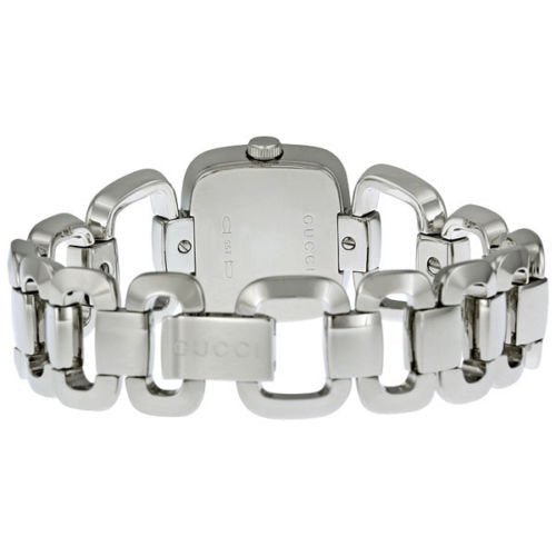 Stainless steel case with a stainless steel bracelet. Fixed stainless steel G-shaped bezel. Black dial with silver-tone hands and stick hour markers. The Gucci name appears below the 12 o'clock position. Dial Type: Analog. Swiss quartz movement. Scratch resistant anti-reflective sapphire crystal. Solid case back. Case diameter: 24 mm. Case thickness: 7 mm. Square case shape. Jewelry clasp. Water resistant at 30 meters / 100 feet. Functions: hours, minutes.