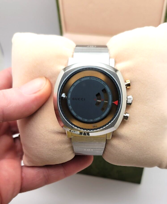Gucci stainless steel quartz watch100% stainless steel. Style number: YA157307Clasp fastening. Rounded square dial, three rotating disks telling the time and date, branded face, triangle at 12'o'clock, Mickey Mouse motif at 6'o'clock, scratch resistant sapphire crystal glass, quartz movement, stainless steel bracelet strap, engraved with GG logo on strap. Case diameter: 40mmWater resistance: 3 bar / 3 atm / 30m / 100ftTwo year manufacturer's warranty. Please refer to the brand's care instructions