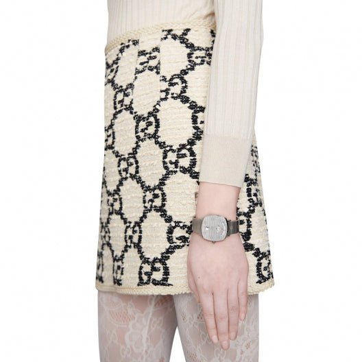 A clean, streamlined design that fits snugly around the wrist, the Grip watch takes its inspiration from the world of skateboarding, its name recalling the way the rider’s sneakers stick to the grip tape on a skateboard. The stainless steel face has three windows to display the hour, minute and date, completed with a matching bracelet with engraved Interlocking Gs. Steel case with engraved Interlocking Gs, 3 windows indicating hour, minute and date, steel bracelet with Interlocking Gs