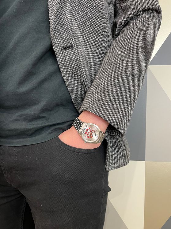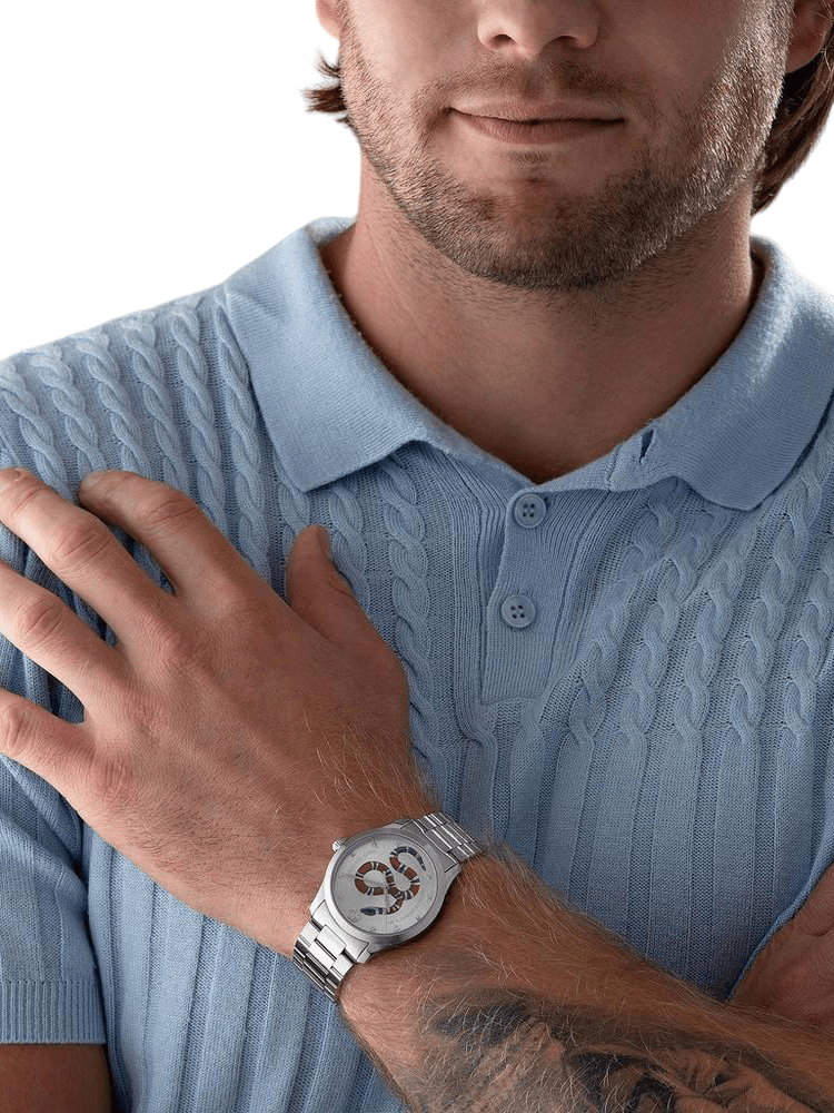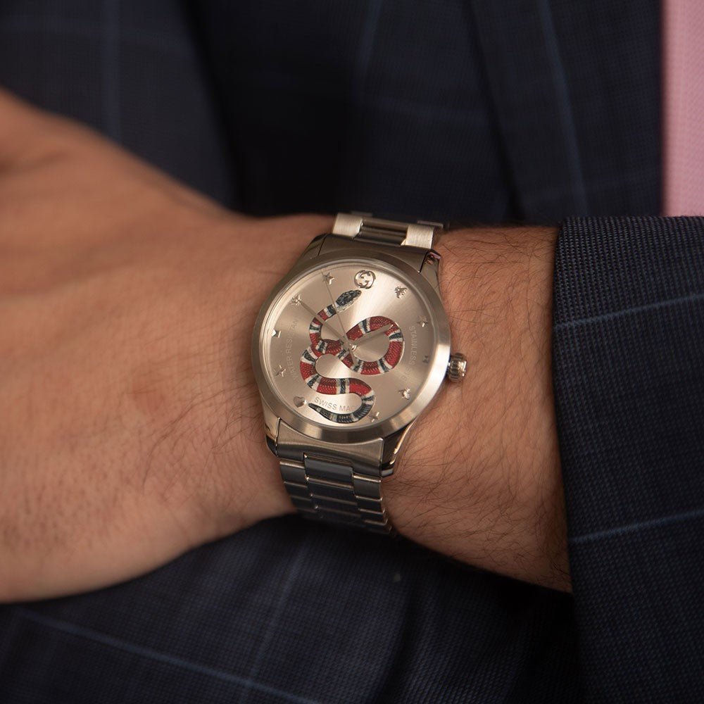 Gents Gucci G-Timeless collection gents stainless steel bracelet watch with steel case. Round silver dial with silver tone detailing and snake design. Swiss made quartz movement with sapphire crystal glass water resistant up to 50 metres. Complete with Gucci presentation packaging with 2 years manufacturers guarantee.