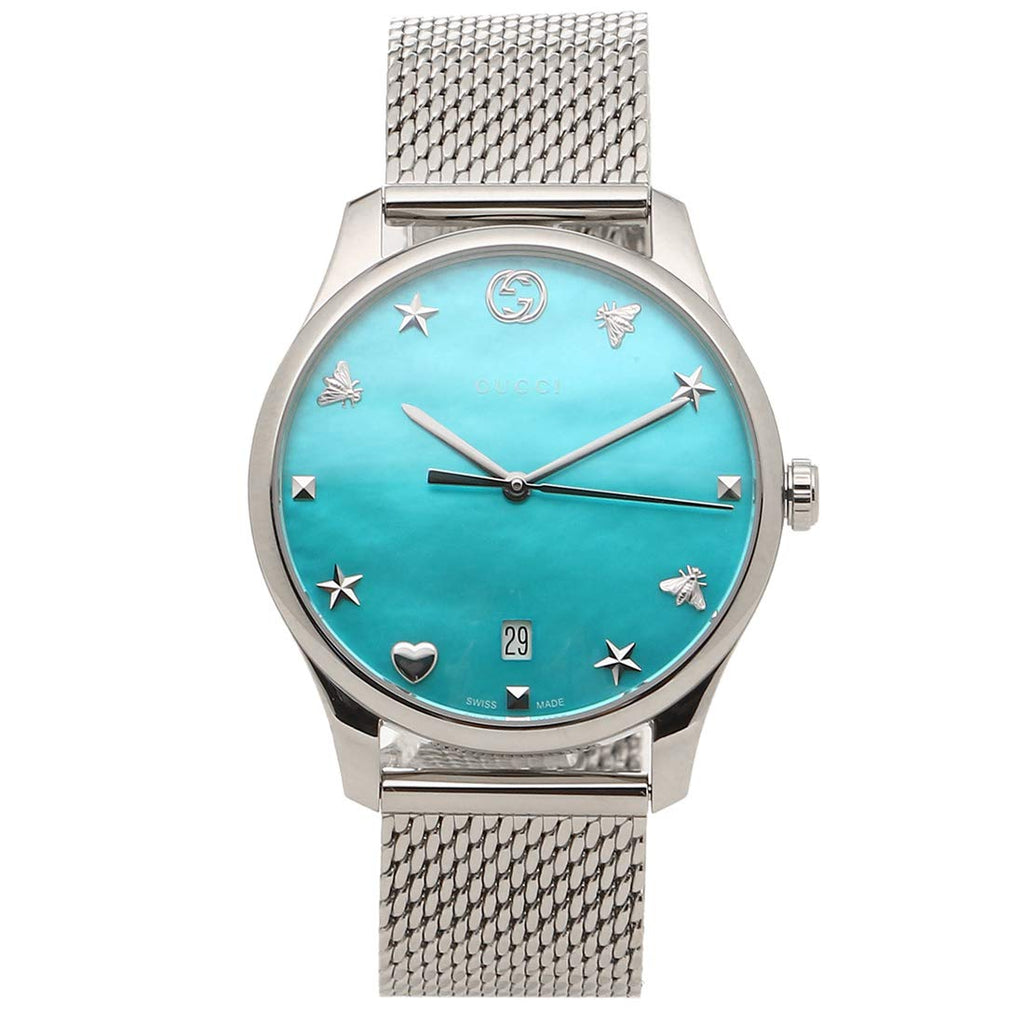Stainless steel case with a stainless steel mesh bracelet. Fixed stainless steel bezel. Turquiose mother of pearl dial with silver-tone hands and house motif hour markers. Dial Type: Analog. Date display at the 6 o'clock position. Quartz movement. Scratch resistant sapphire crystal. Pull / push crown. Solid case back. Round case shape. Case size: 36 mm. Case thickness: 8 mm. Band width: 18 mm. Fold over clasp. Water resistant at 50 meters / 165 feet. Functions: date, hour, minute, second. Dress watch style. Watch label: Swiss Made. Gucci G-Timeless Turquiose Mother of Pearl Dial Ladies Mesh Watch YA1264039.