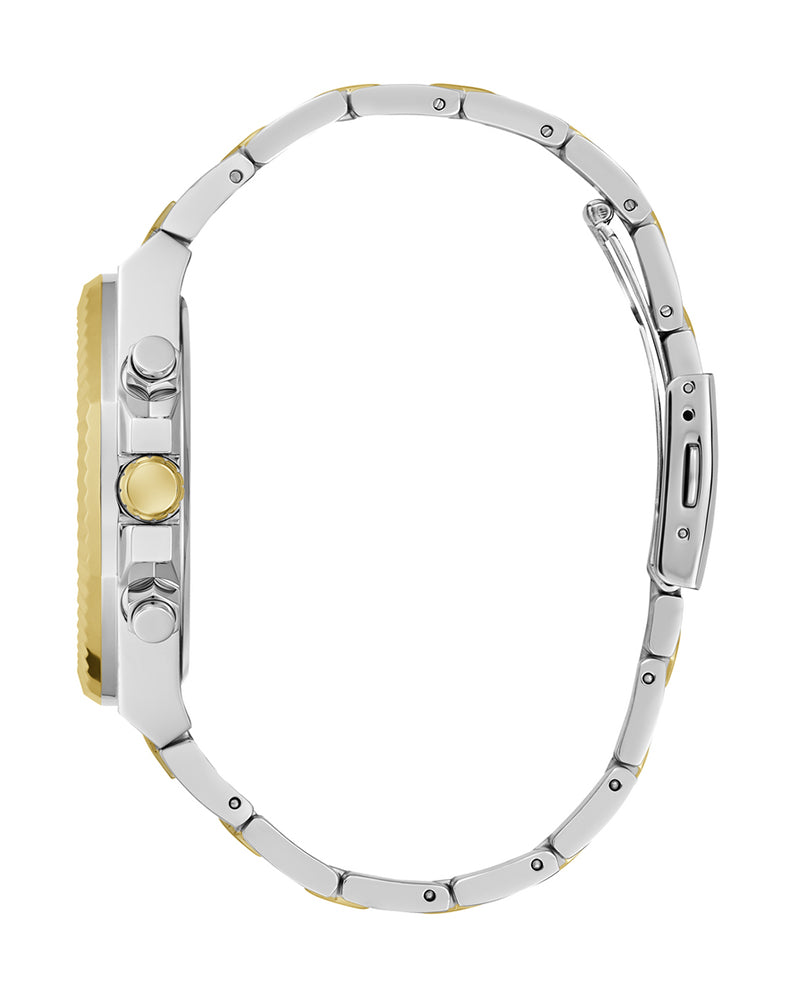 The details of the embossed bezel and the Chrono-style pushers add a touch of dynamism to the overall design of the watch. Additionally, its bold style and two-tone finish make it stand out, adding a distinctive touch.