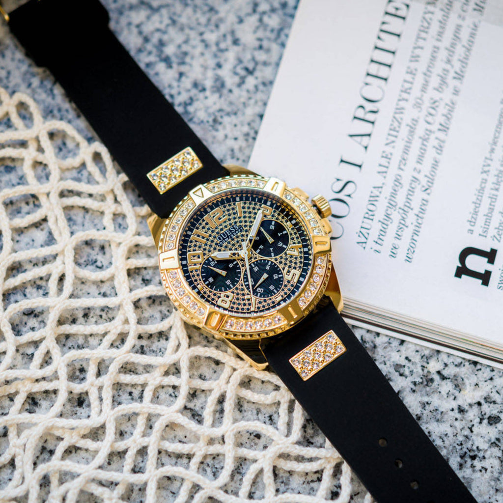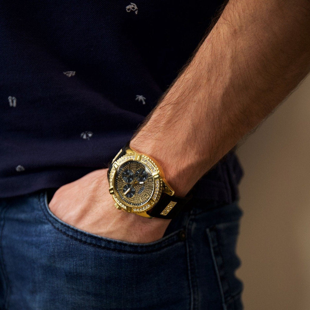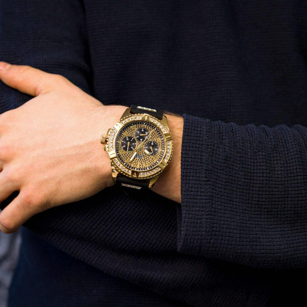 Make a striking impression with the Black and Gold Crystal Case timepiece. This watch boasts a gold-tone stainless steel case adorned with sparkling crystal accents, complemented by a sleek black silicone strap and a sophisticated black multi-function dial.