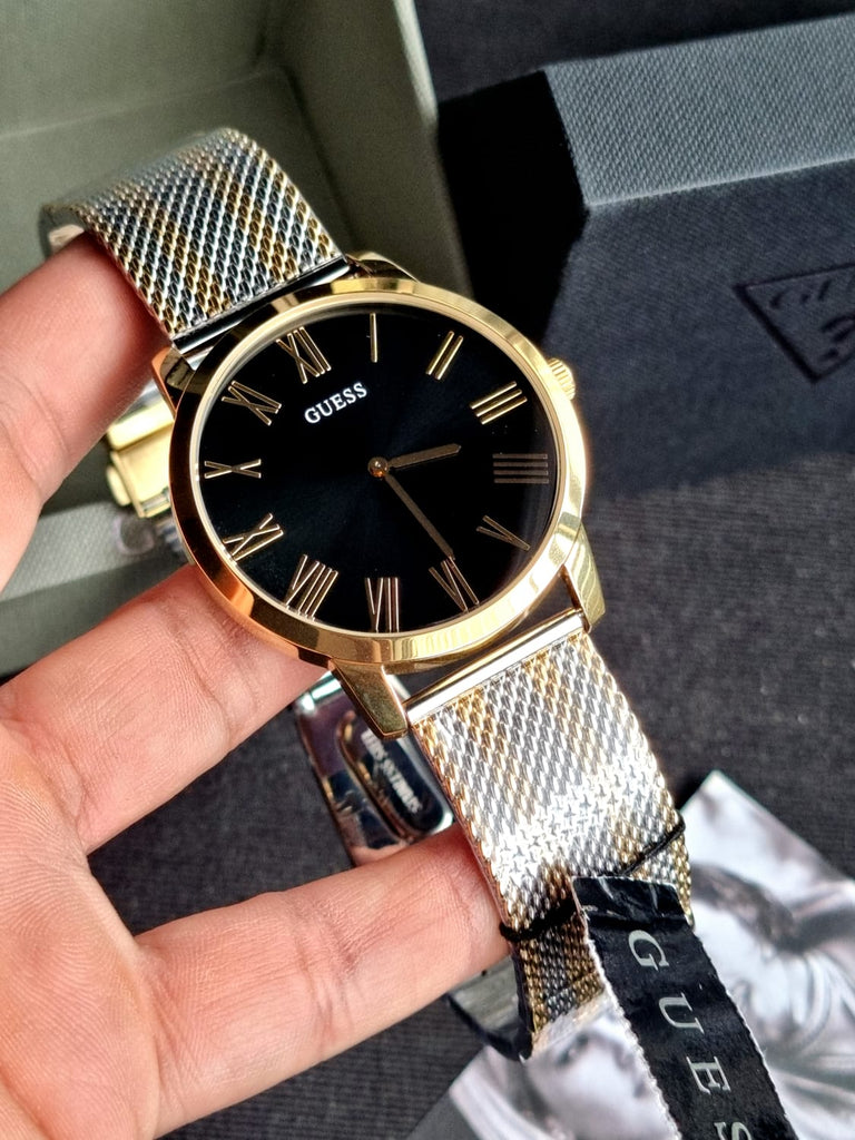 GUESS Gents watch with polished gold case, sunray black dial with gold highlights and polished gold mesh bracelet with silver stripes.