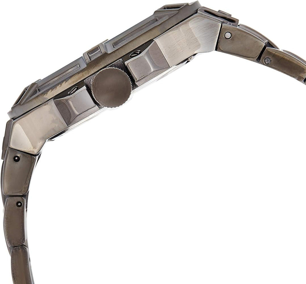 Grey ion-plated stainless steel case with a grey ion-plated stainless steel bracelet with black ion-plated center links. Fixed grey ion-plated stainless steel bezel. Grey dial with luminous black hands and alternating Arabic numeral and index hour markers. Minute markers around the outer rim.