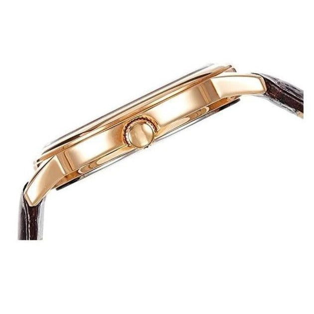 Guess men's multifunction wristwatch WAFER Collection, Case (39.5 mm) in polished IP rose gold steel, Khaki dial with rose gold details, Brown crocodile print leather strap, quartz movement, analog display type, mineral glass. The watch is water resistant to 3ATM